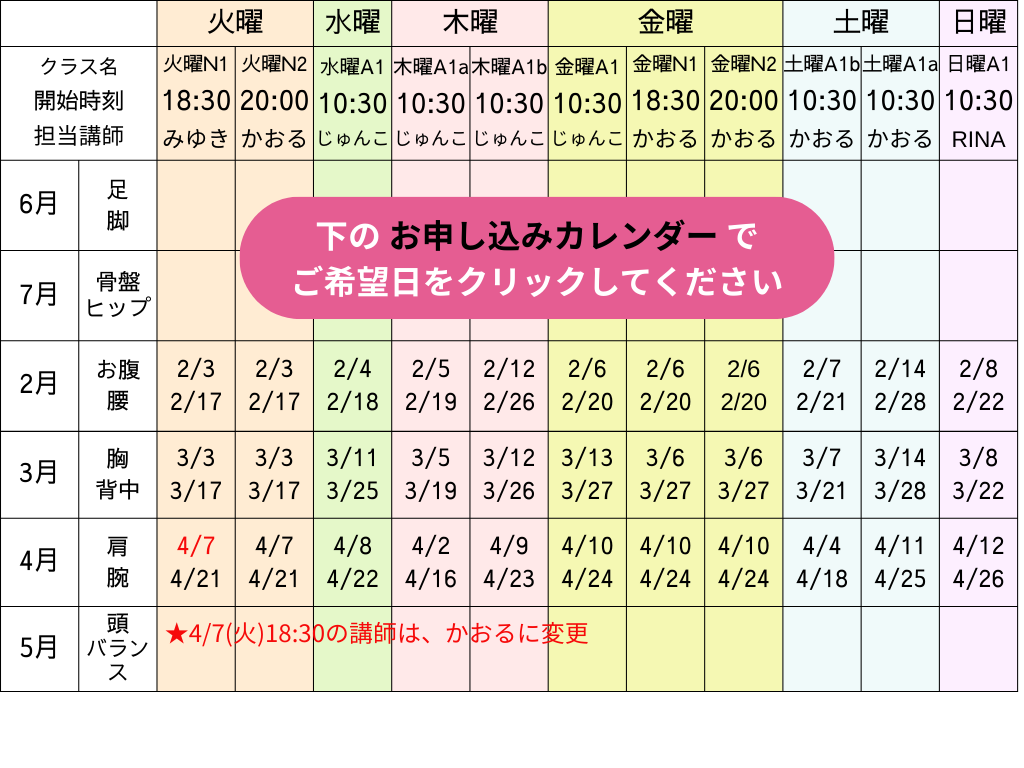11クラスあり、どのクラスでも受講可能です(満席日を除く)。下記から「ご希望日」をお決めいただき、お申し込みカレンダーで「ご希望日」をクリック→お申し込みフォームへお進みください。